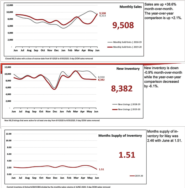 â—Pending sales for Single Family, Town-home, Condos for June are 7,570 whe-reas, May was 5,930 and April were 5,299